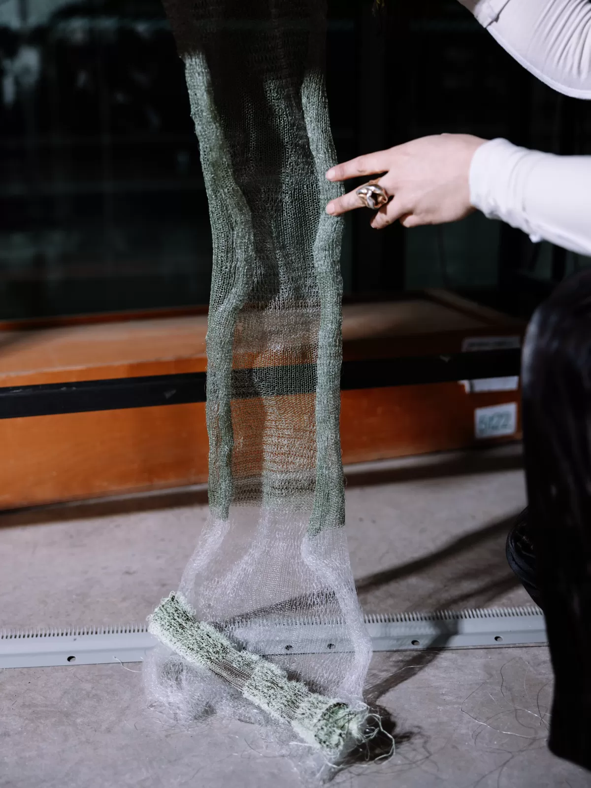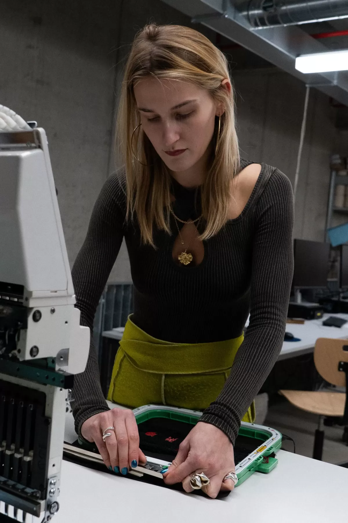 Projekt zároveň navazuje na můj dlouhodobý výzkum pletacích technik. Ve školní dílně však lze experimentovat pouze s hrubšími materiály a omezenými stroji. Proto musím spolupracovat s externím pracovištěm, kde je možné pracovat na průmyslovém pletacím stroji ve spolupráci s programátorem.